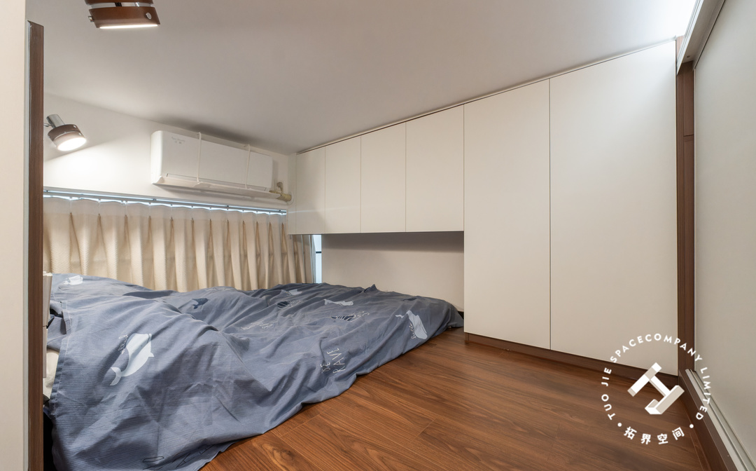 充分挖掘墙面潜力,在所有可利用的墙面上定制通体衣柜,彻底满足居者的收纳需求;同时隔层卧室选用 PD 折叠门作为隔断,更将每一寸空间都用到实处。