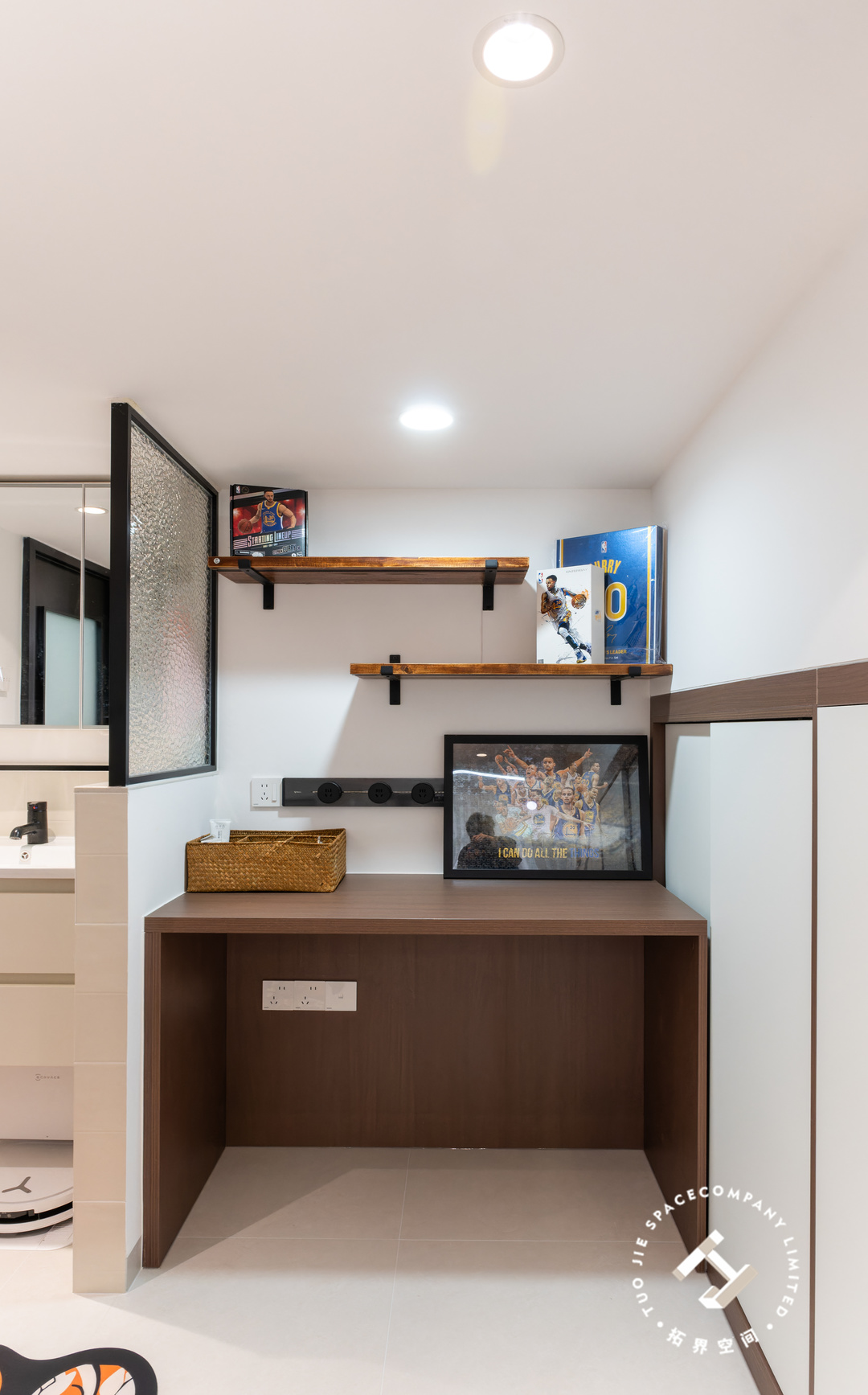 外置的洗漱区采用半墙玻璃与书房相隔,既保证了空间的通透感,又巧妙划分了功能区;浴室内更是利用了玻璃推拉门作为隔断,实现了干湿分离的需求。