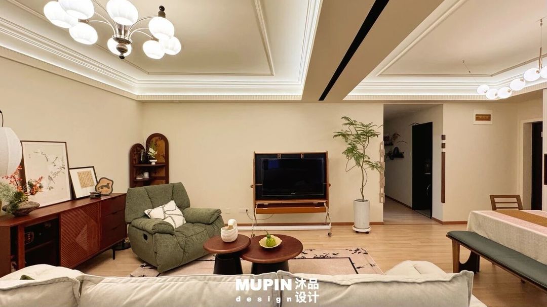 延续浅色调基底,浅色沙发、木质电视架与中式置物架和谐共处。