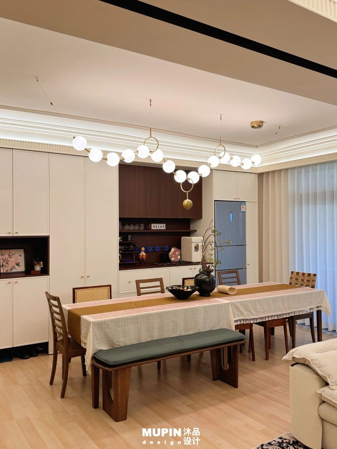 与后方深浅搭配的餐边柜形成功能与美学的平衡。
