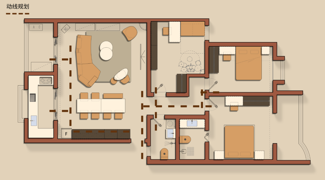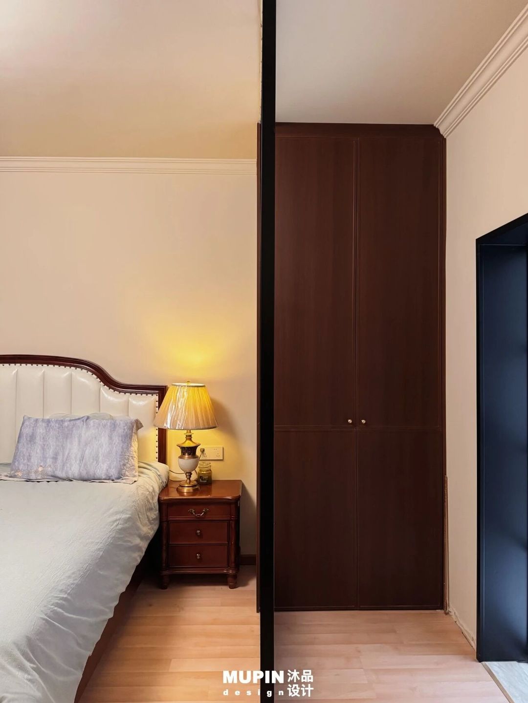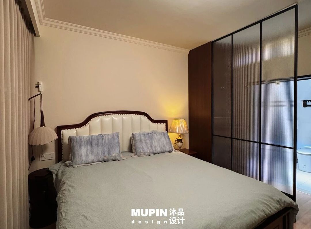 ③主卧的床体与卫生间正对,为了满足隐私性,在两者之间设计长虹玻璃的屏风,可以同时满足私密性和通透性。