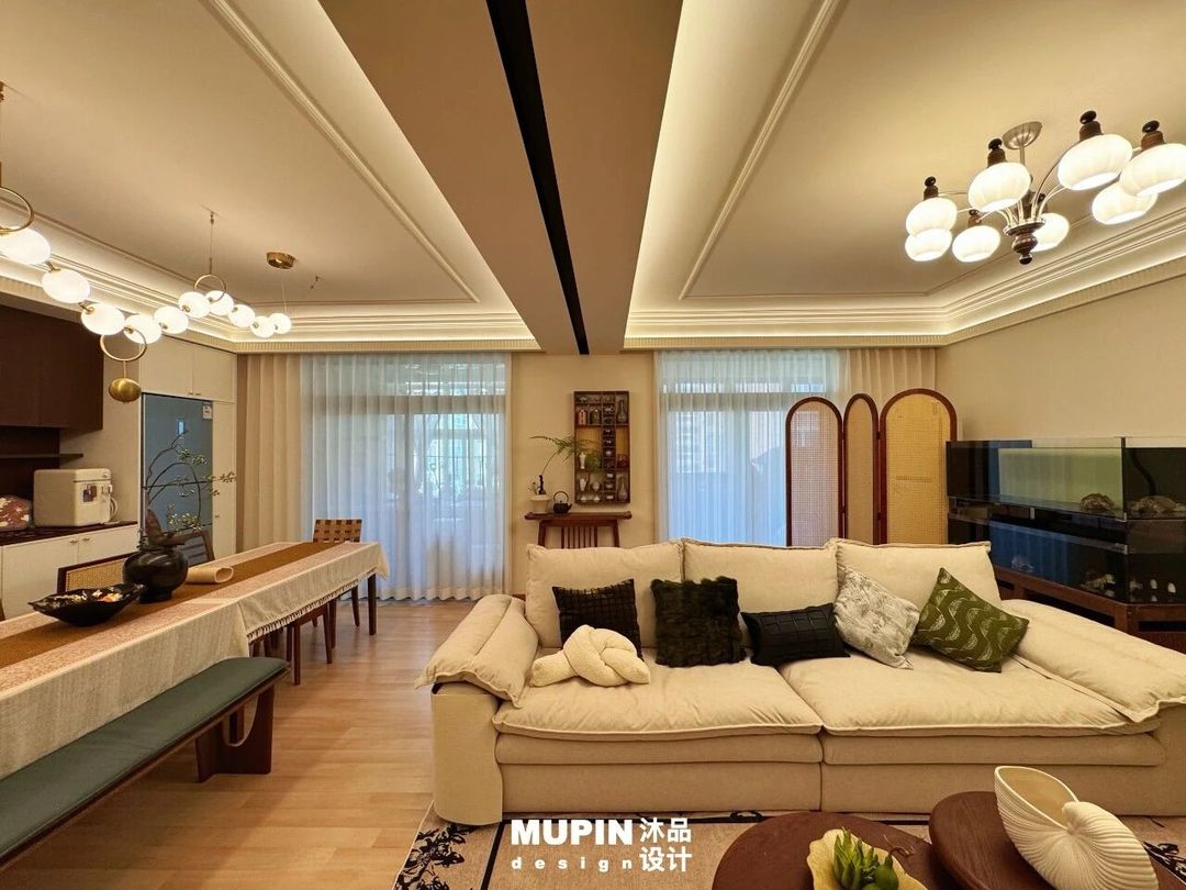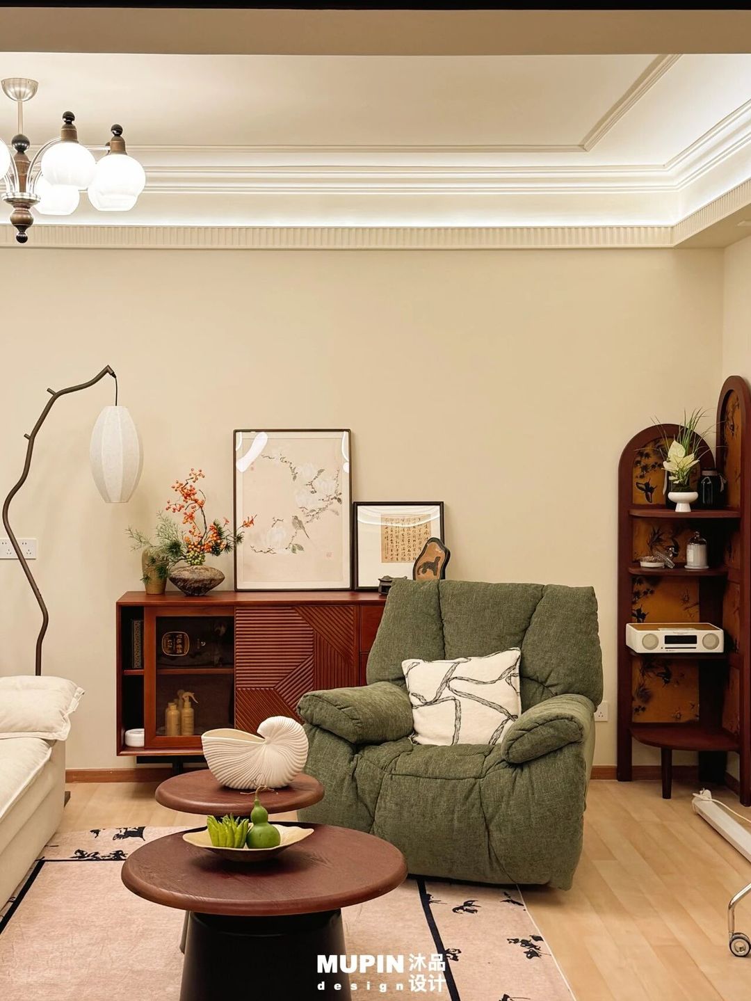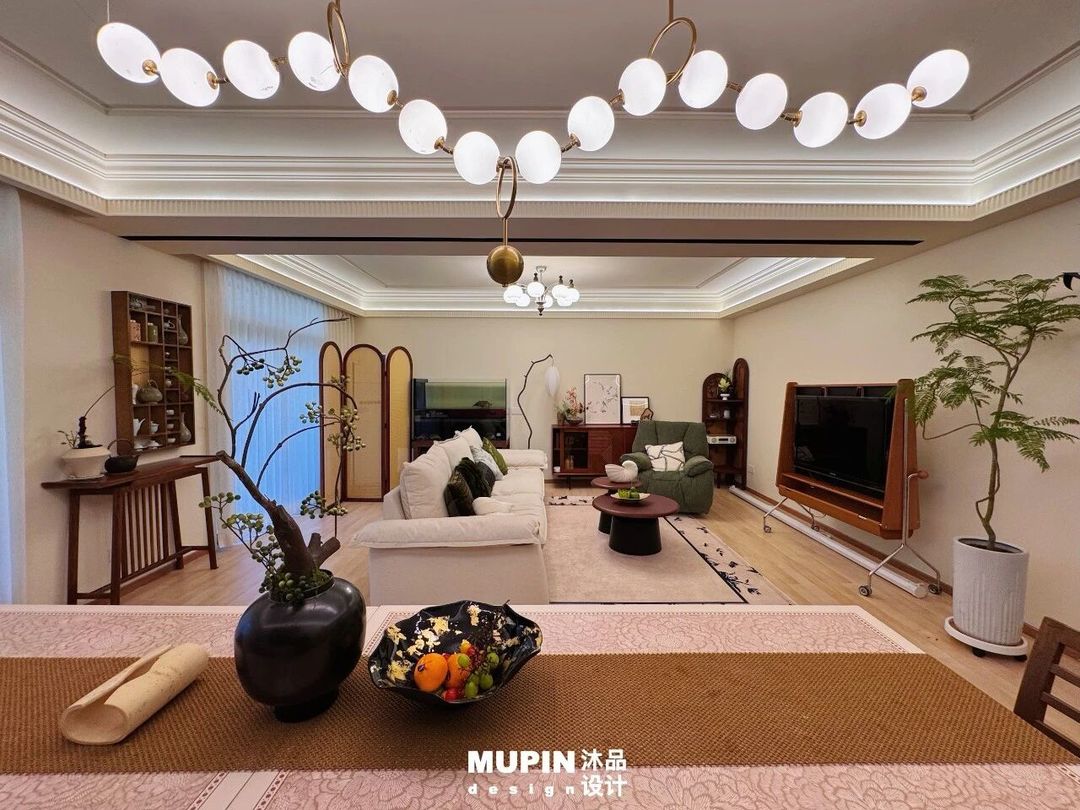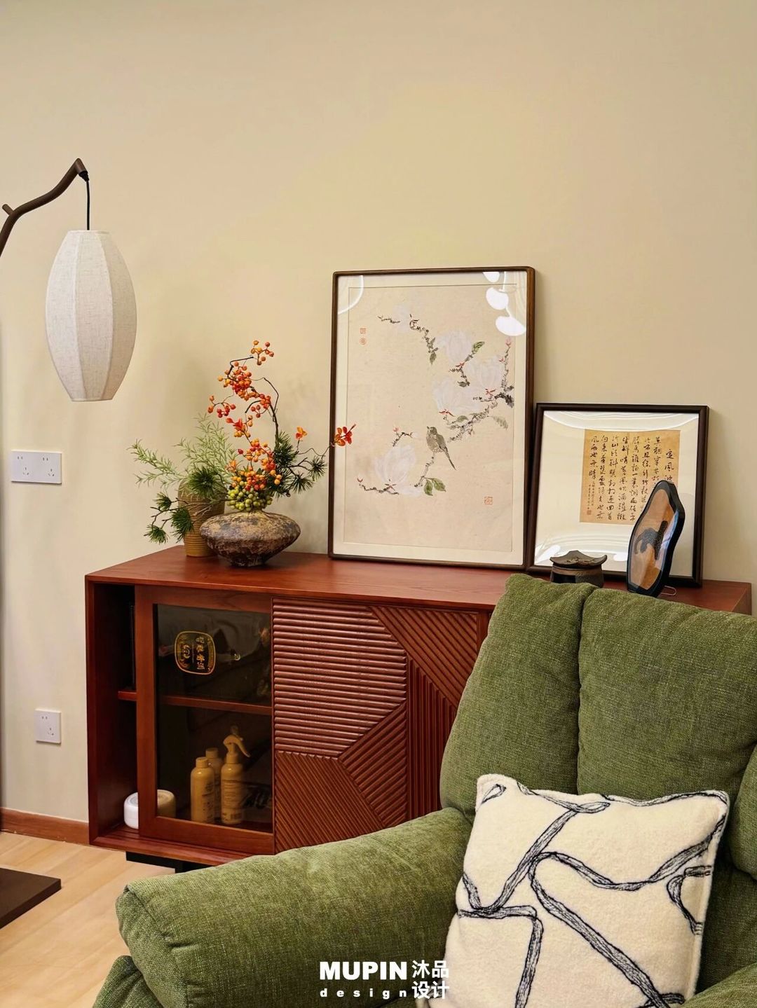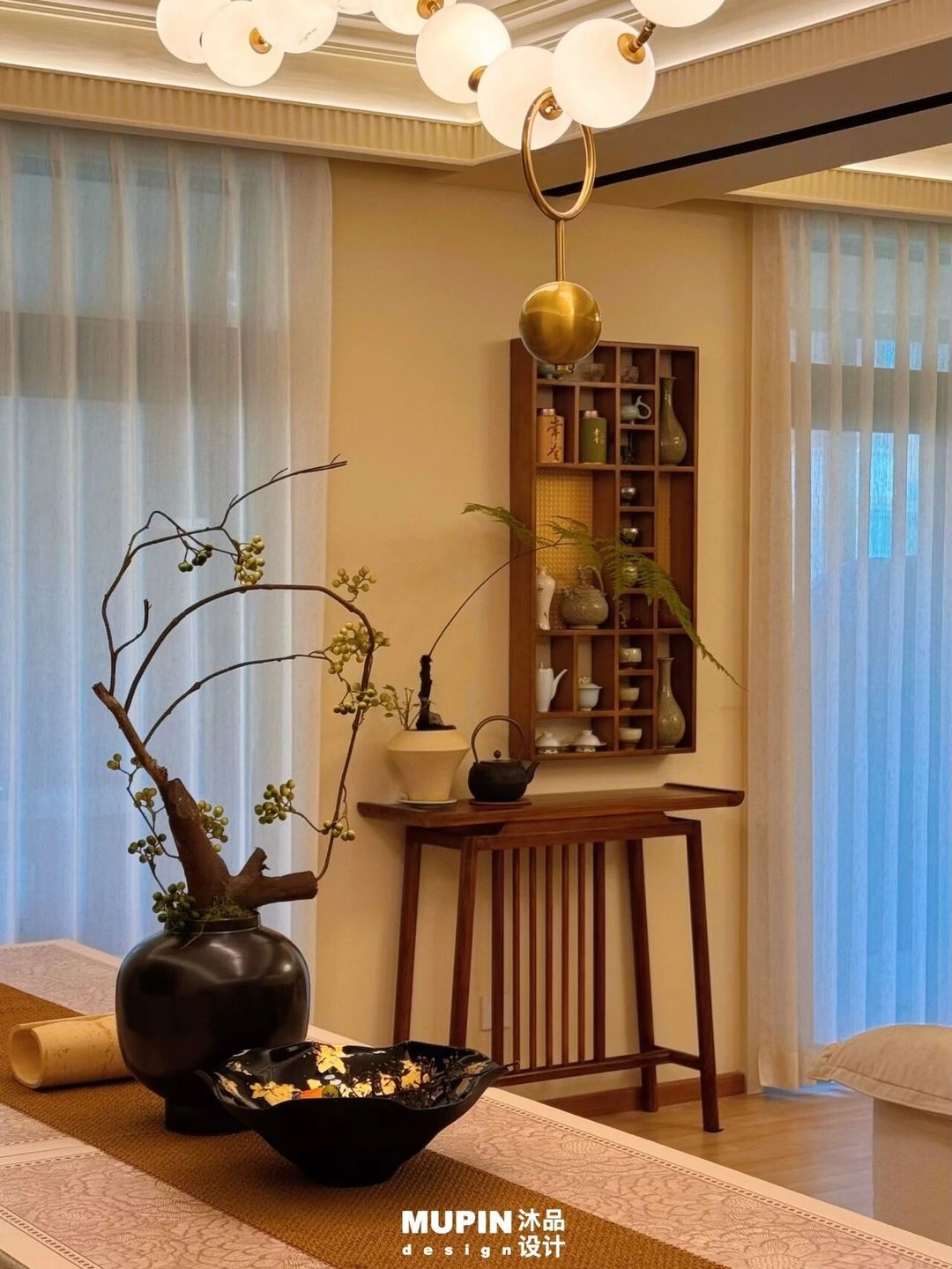 综合以上,设计师迎合整体氛围,将墙面以及顶面做了微改的同时,在软装上做了构思,拒绝刻意雕琢的痕迹,打造了一个复古又充满自然感的新中式之家。