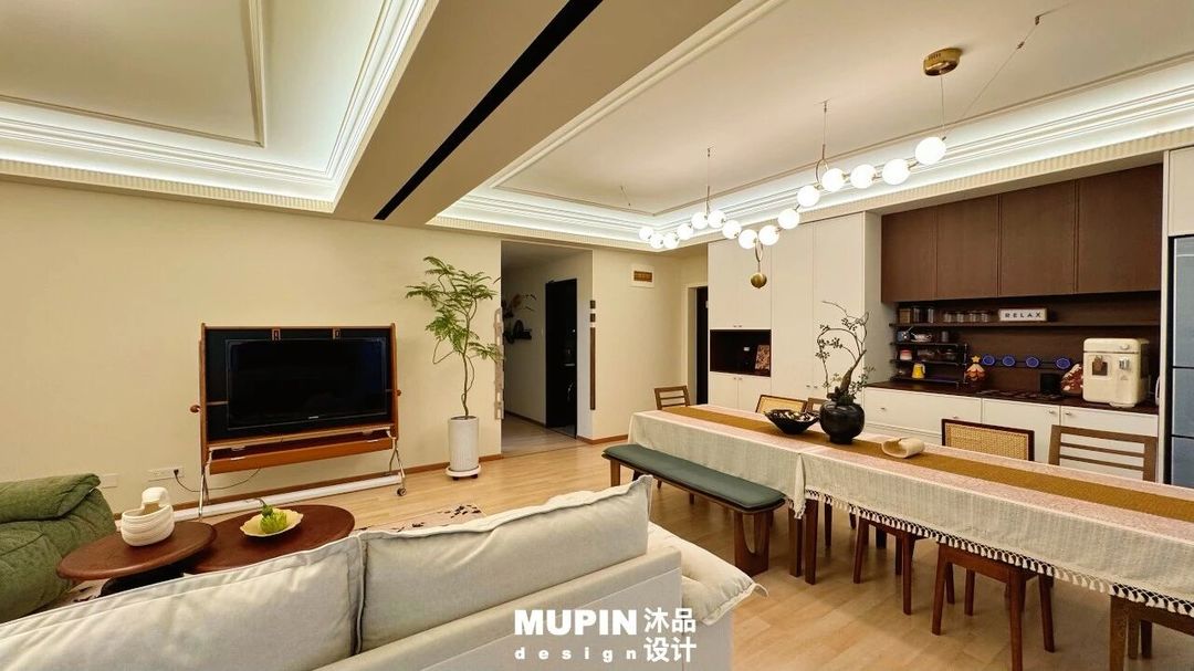 客厅的沙发、餐厅的餐桌、厨房的实用操作区,彼此呼应又互不干扰,让家人间的互动交流更自然,也让空间因通透感而显得格外宽敞。