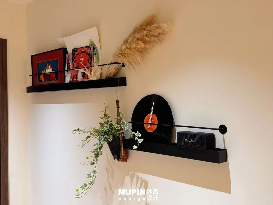 墙面上错落有致的置物架陈列着黑胶唱片,