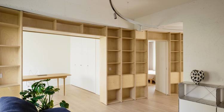 作为居住空间,必要的领域划分依然存在。书架墙体结合内退的房门,保留独处与互动的自由。移门、平开门与走道,共同成为调节公私尺度的媒介。客厅的家具布局强化互动可能,三向视野扩展空间张力。