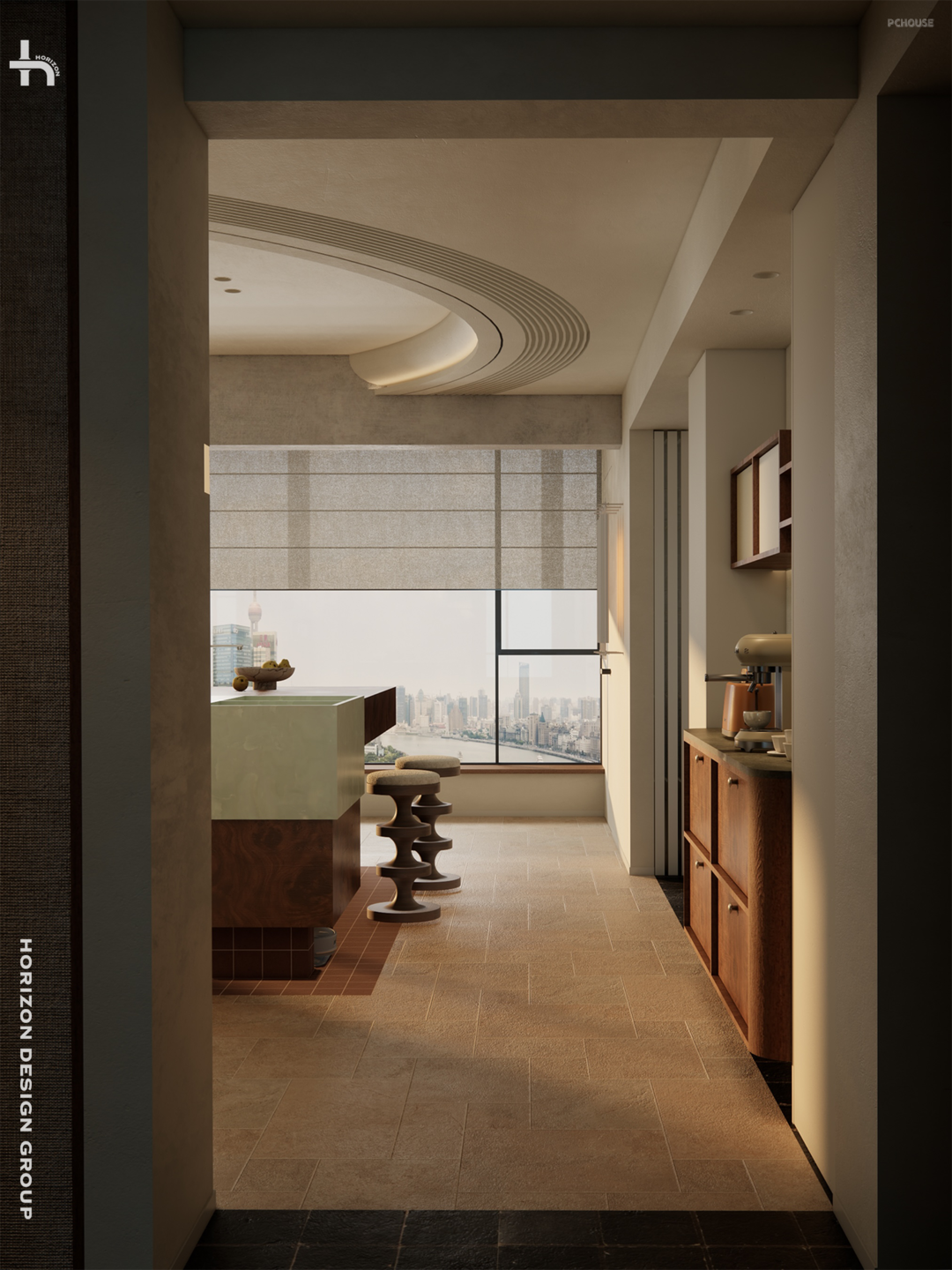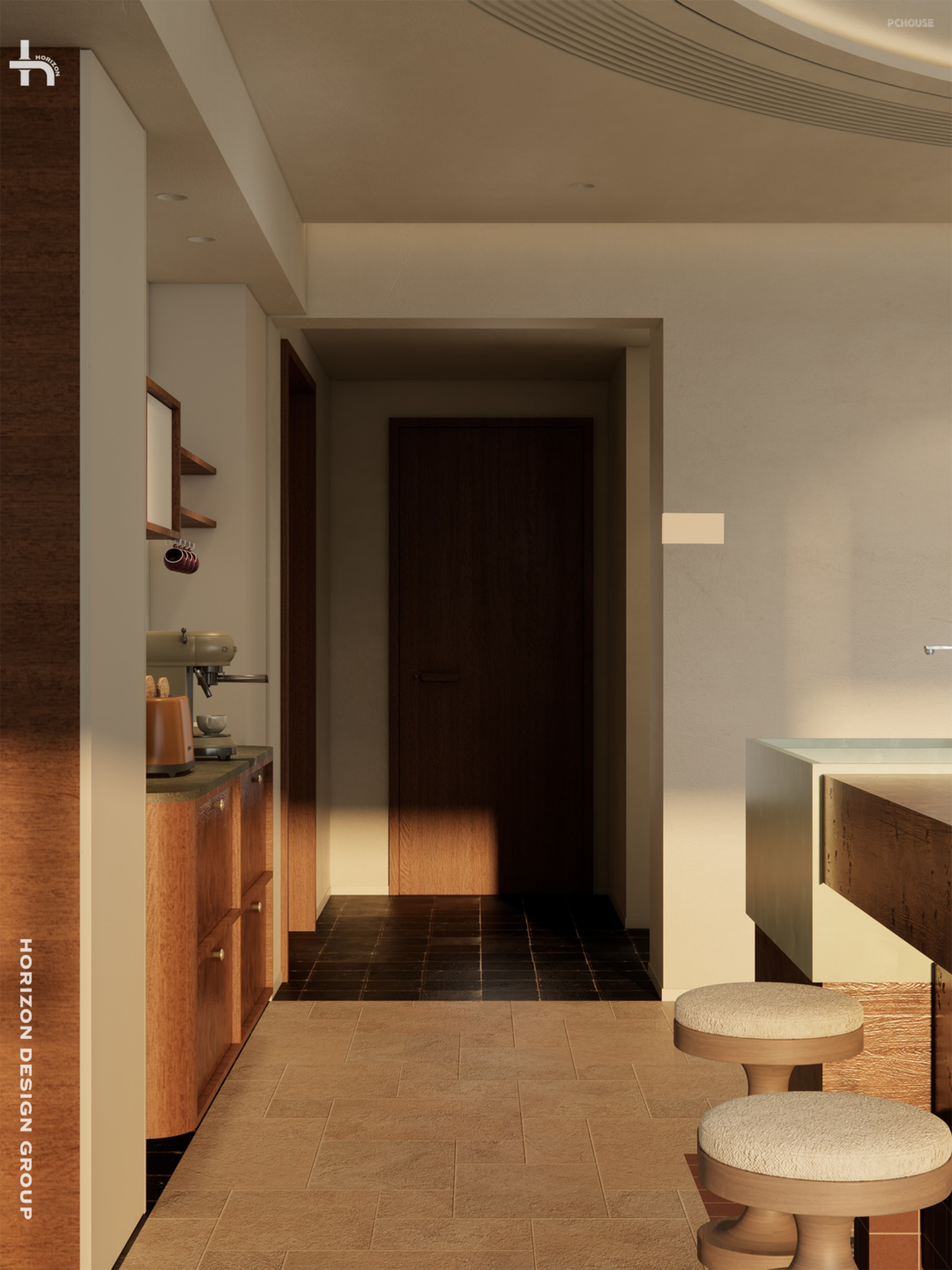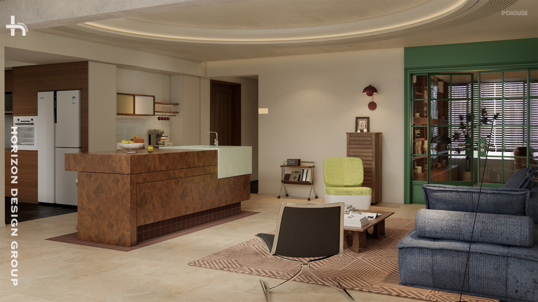 从深邃甬道的「画框」所凝视的焦点,正是家中充满灵魂的餐岛区域,它完美融合了中古韵味、实用功能、独特的材质艺术、独具特色的拉伸式设计以及三重材质的碰撞: