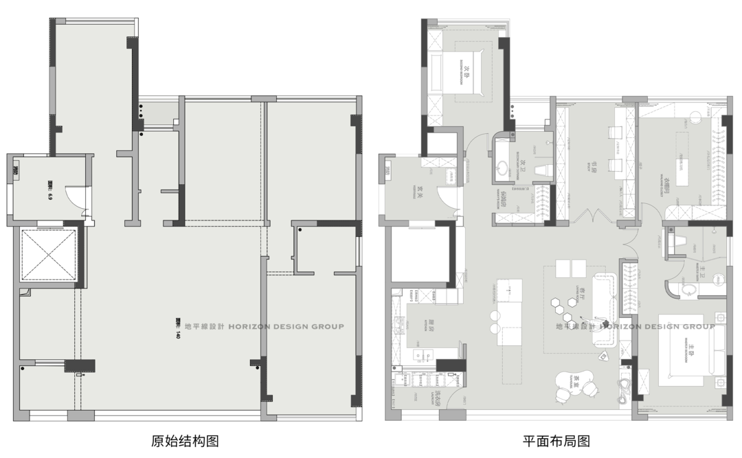 本案的原始结构很方正,于是设计师没有大刀阔斧的调整,只在平面中做出了相应的优化,即在空间中实现了共享与独处的精妙平衡:书房化身为主人们的「手办宇宙」与静谧的创作天地;客厅纳入阳台,精心布置了一隅茶道静观之地;重构主卧尺度,外扩部分空间并规划了强大的隐形收纳。