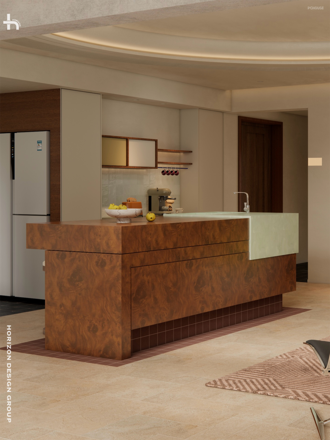 这一圈地面的小方砖超越常规的地面铺贴,犹如为岛台定制了专属的「底座」,使其成为空间中无可争议的视觉焦点。