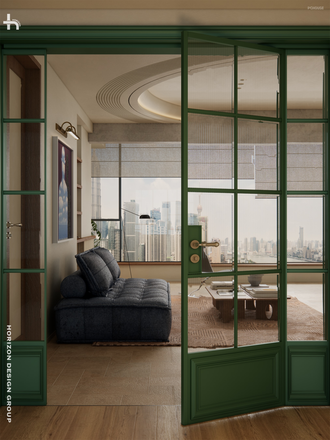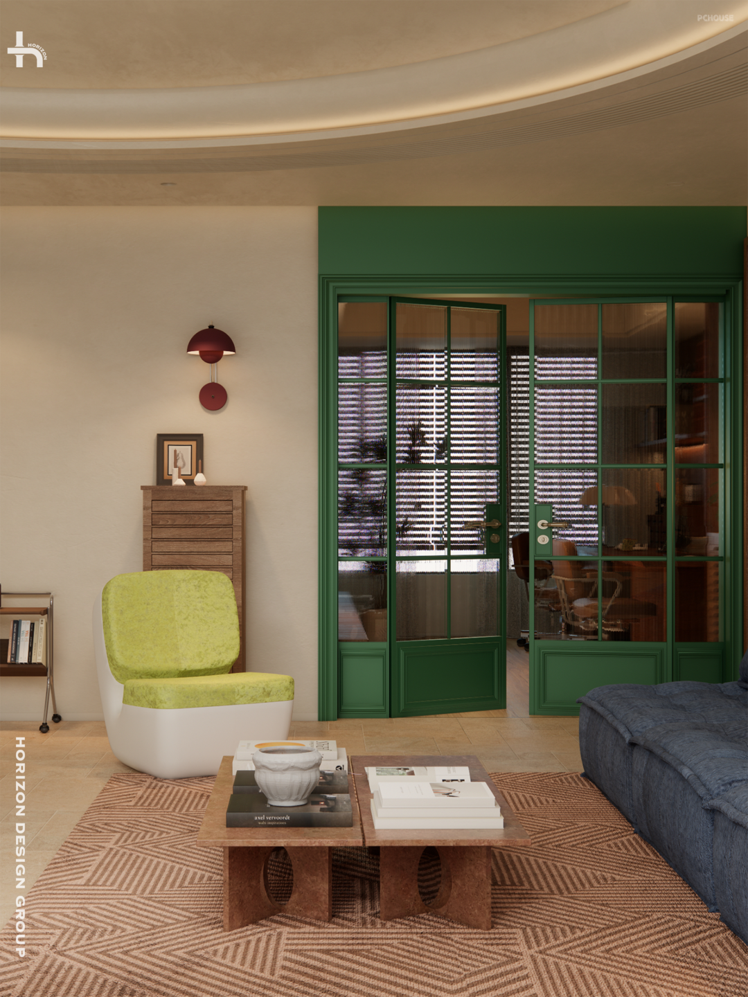 高饱和度的绿色推拉门毫无疑问是客厅的神来之笔,不仅完美融入整体空间基调,同时带来了戏剧性、复古灵魂和活力的点缀。