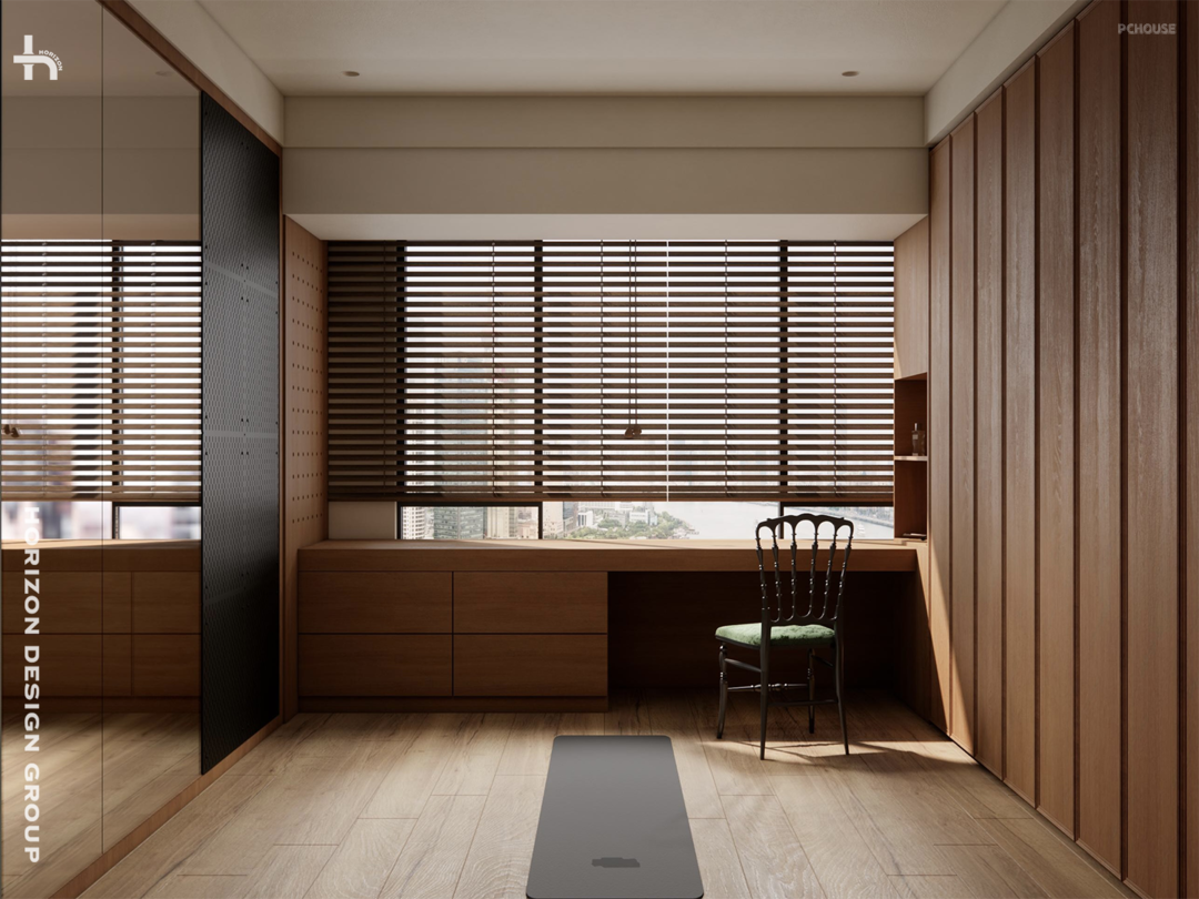 温润的木质是衣帽间的主角,奠定了空间的自然、温暖和中古气息,而拼接的洞洞板及镜面则巧妙融入了现代的功能性和张力,与柚木形成鲜明对比,这样的组合让衣帽间充满了设计感,也完美呼应了整体基调。
