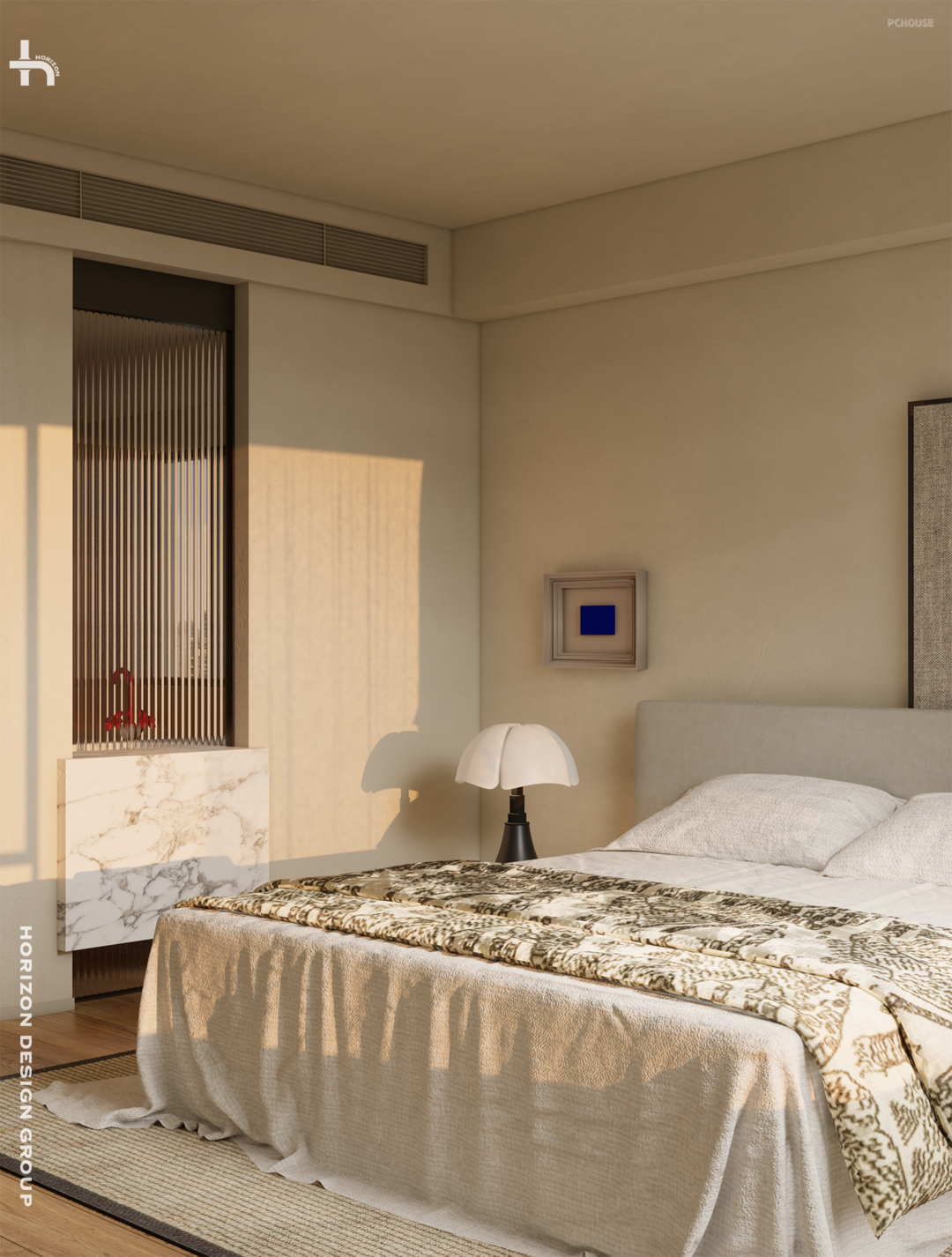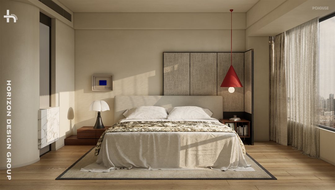 主卧,勾勒出一个舒适又不失个性的空间,圆弧的过道是柔和的基调,中古屏风增添了复古的情调和空间层次,而那盏红色吊灯则如同卧室里的艺术核心,将空间点亮。