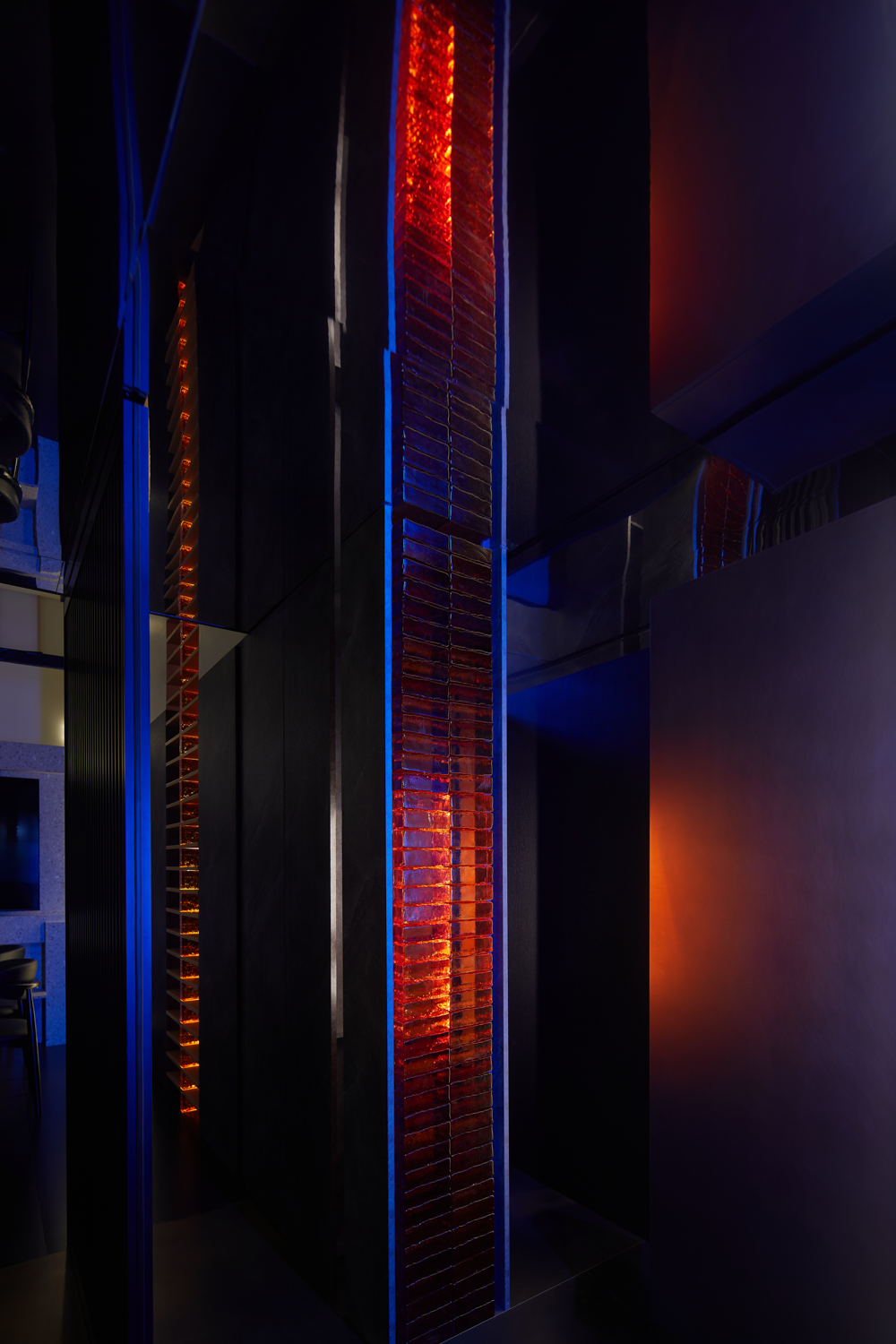 空间中“熔岩”概念灯光以木作经典的榫卯手法融合栅栏概念,应和空间主题,顶部蔚蓝色光带透过格栅与红色亚克力灯光形成强烈的对比,表达具有挑战精神的品牌形象,同时自然衔接起顶面与立面的空间关系。