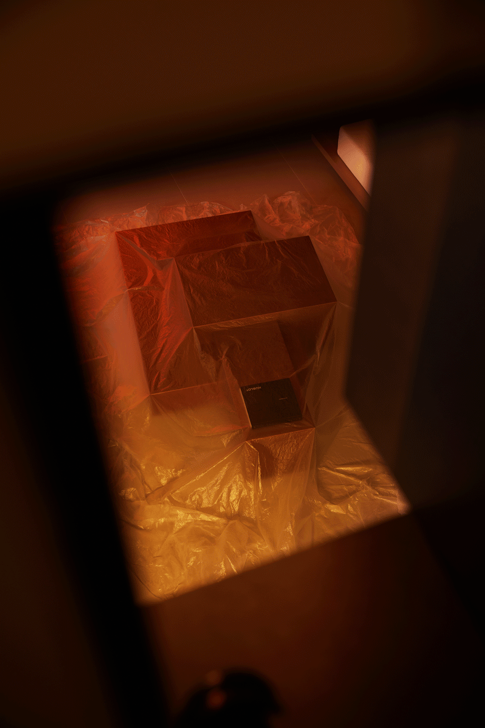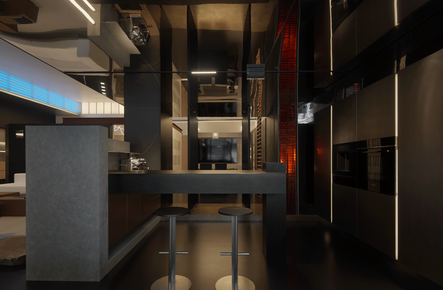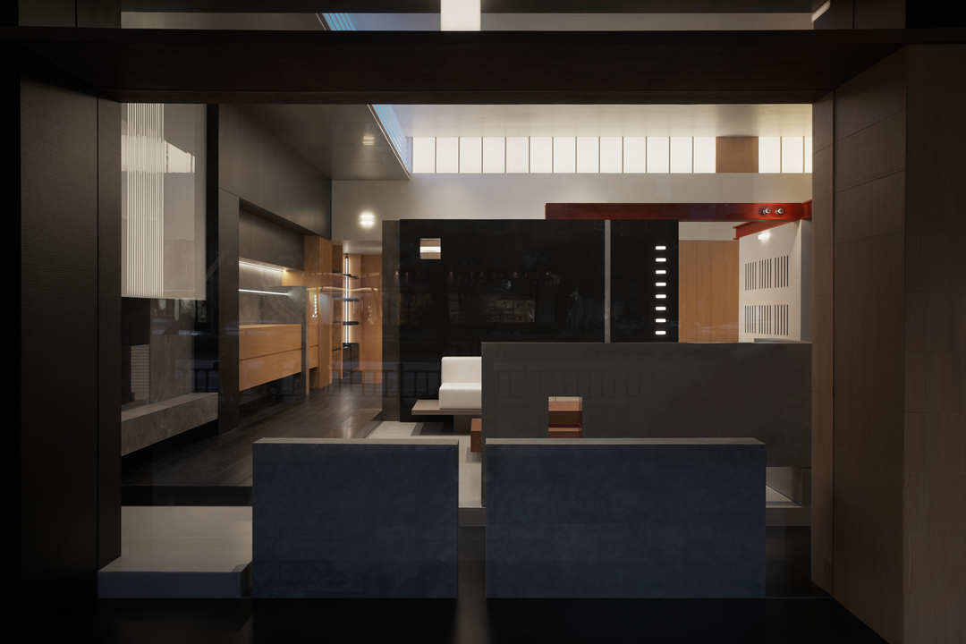 作为产品外向输出主要区域的展示厅,同样兼具洽谈与沉浸式体验功能,与水吧台区域的红蓝灯光对应的,此处相同的色彩则表达着相对柔和自然的生活状态,木作产品被自然置入空间的实际运用中,通过与不同材质间的拼洽,通过纤毫毕现的细节展示,通过配合五金配件达成的使用效果,呈现出更为真实的体验感受,从而促成商业转换的目的。