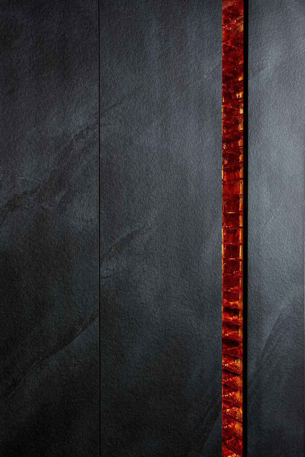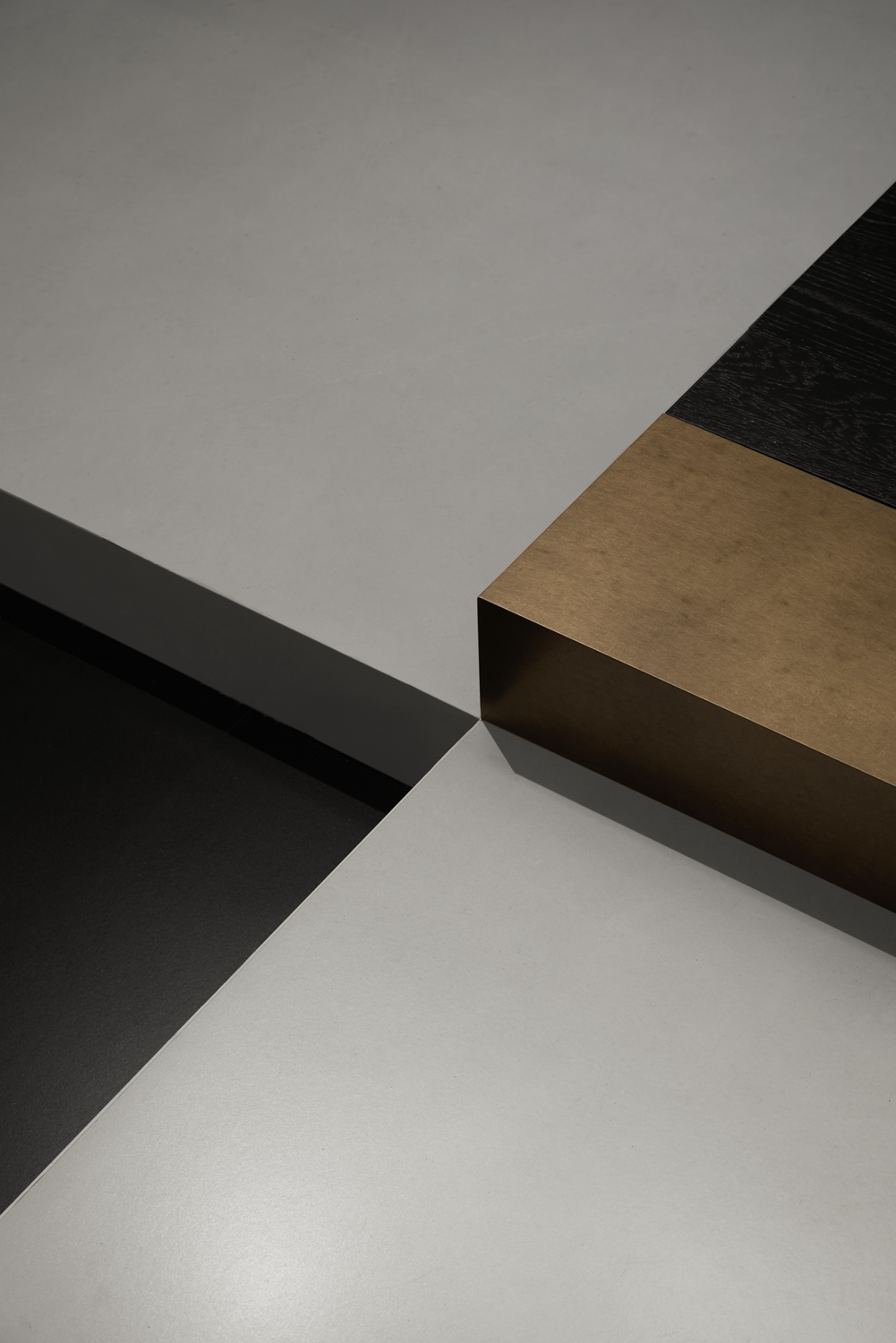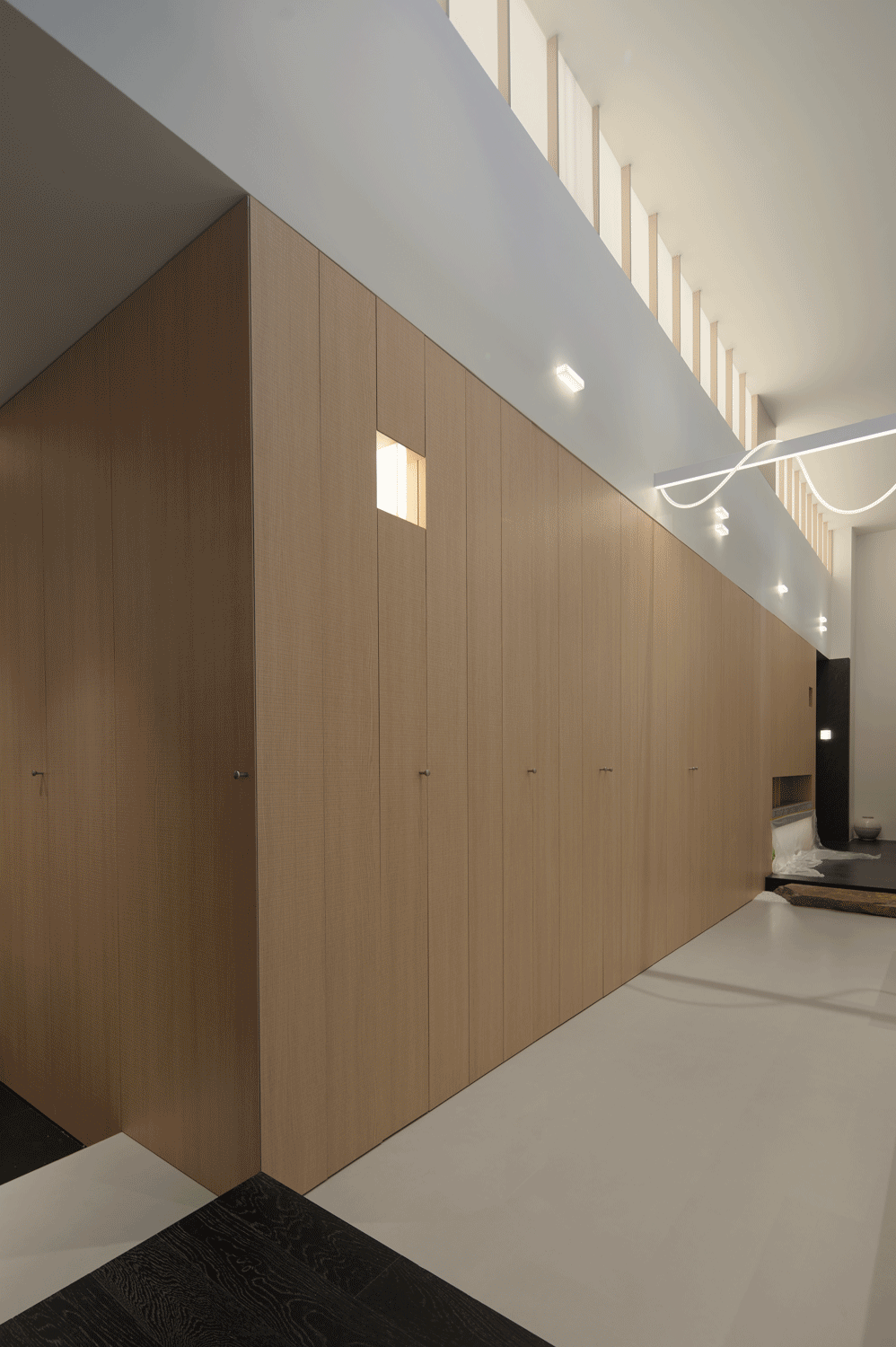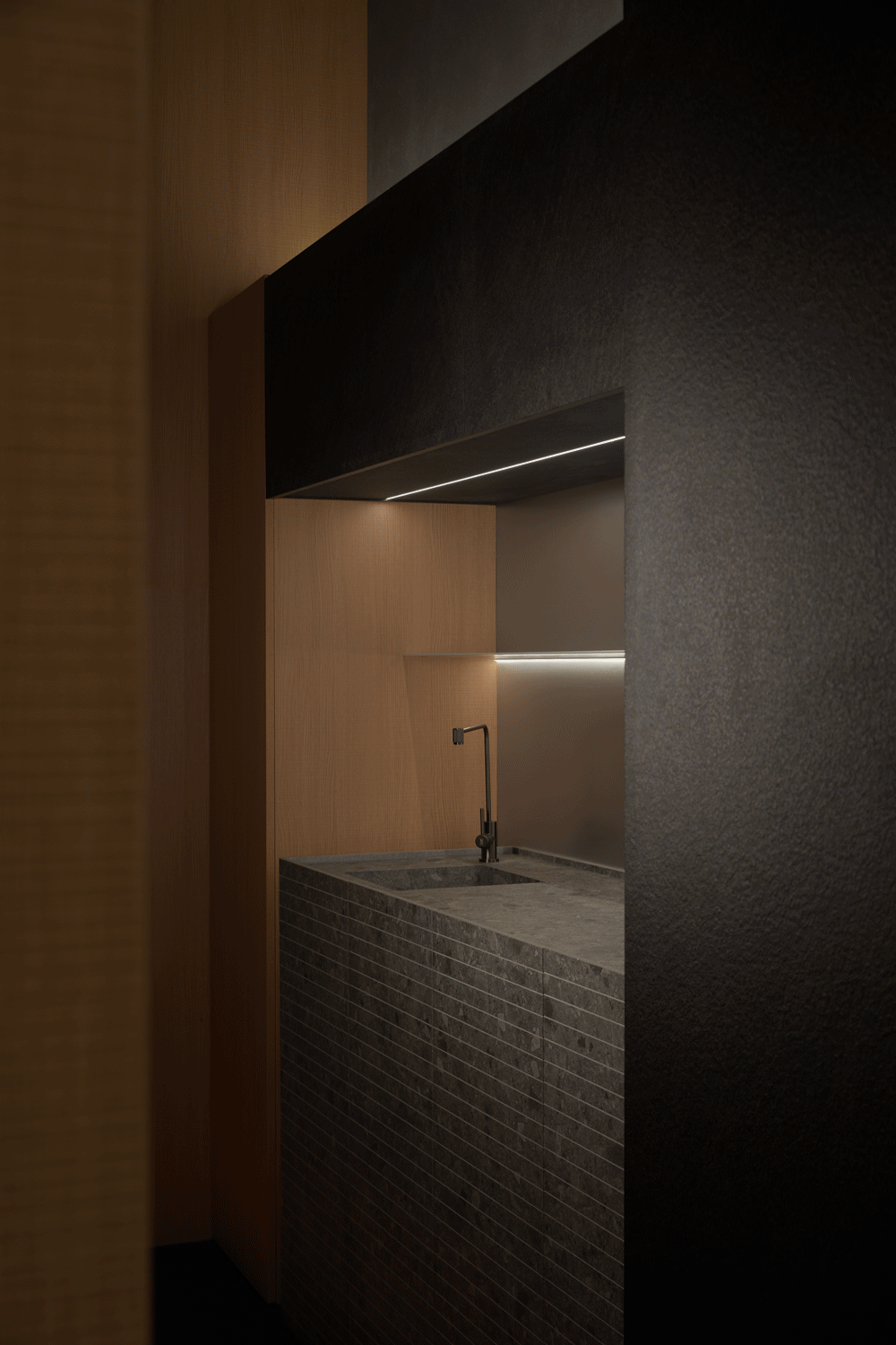 样品区被呈现于空间的最深处,这也洽和了顾客从参观,乃至了解,最后到下定的这一完整商业行为路径,不同板材的具体展示也被隐藏于墙体后方,在推拉式的结构中得到完整呈现,同时保持立面的简约状态。